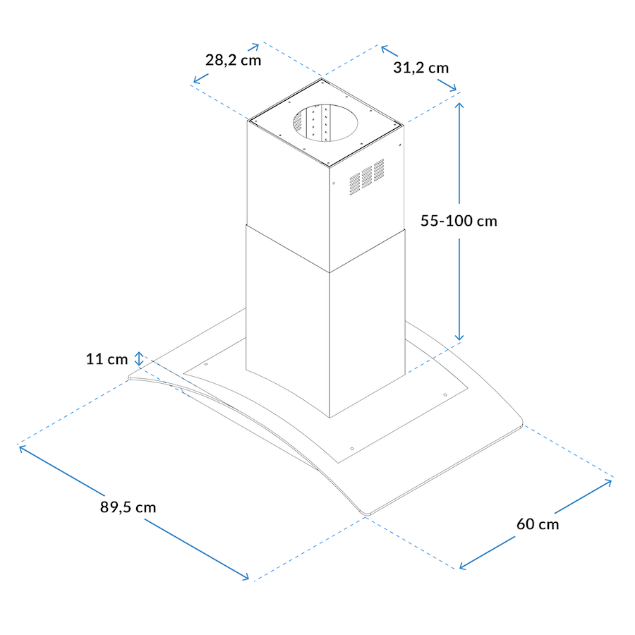 Deze eiland afzuigkap 90 cm heeft een luxe design van glas. Aandacht voor details staat centraal en dat zie jij terug vanuit elke plek in jouw keuken. De grote subtiel gebogen glazen kap is naast praktisch – om alle af te voeren lucht op te vangen – ook prachtig om te zien.