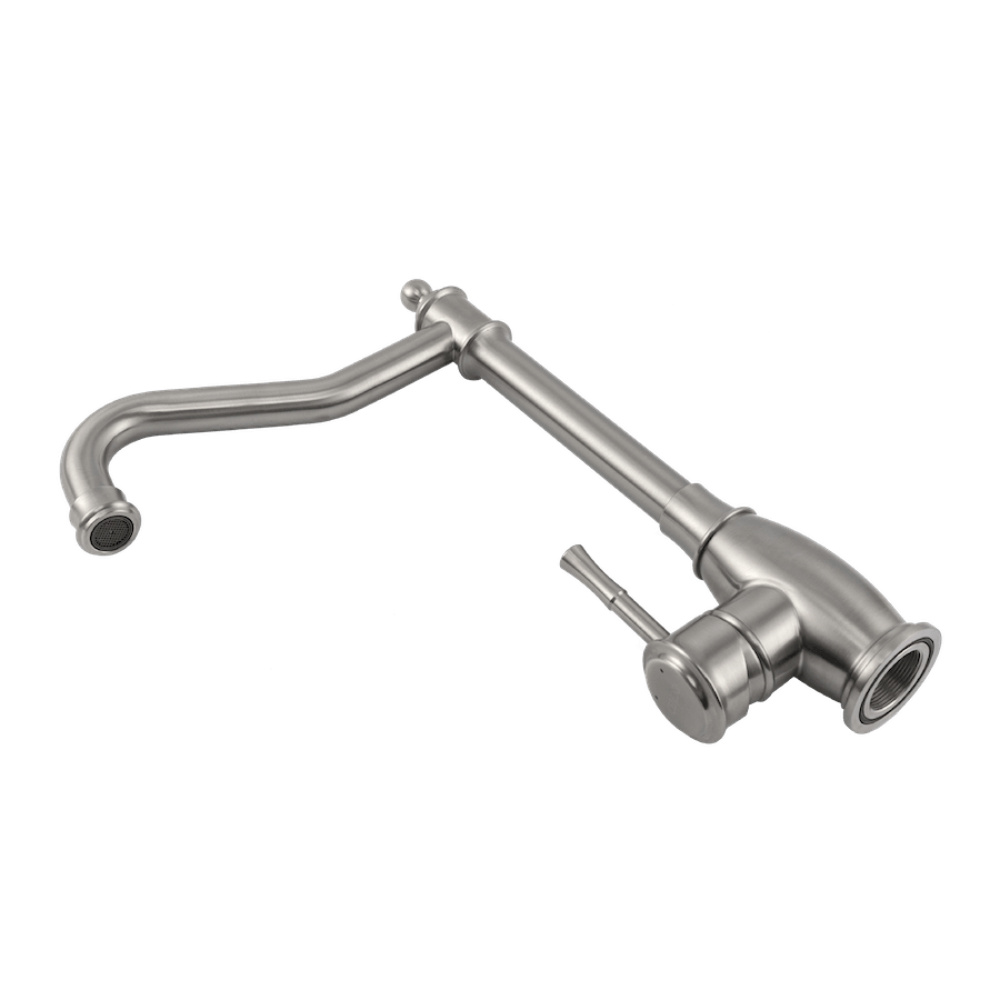 Puur RVS in perfecte vormen resulteren in deze landelijke keukenkraan met een klassieke draaibare uitloop.